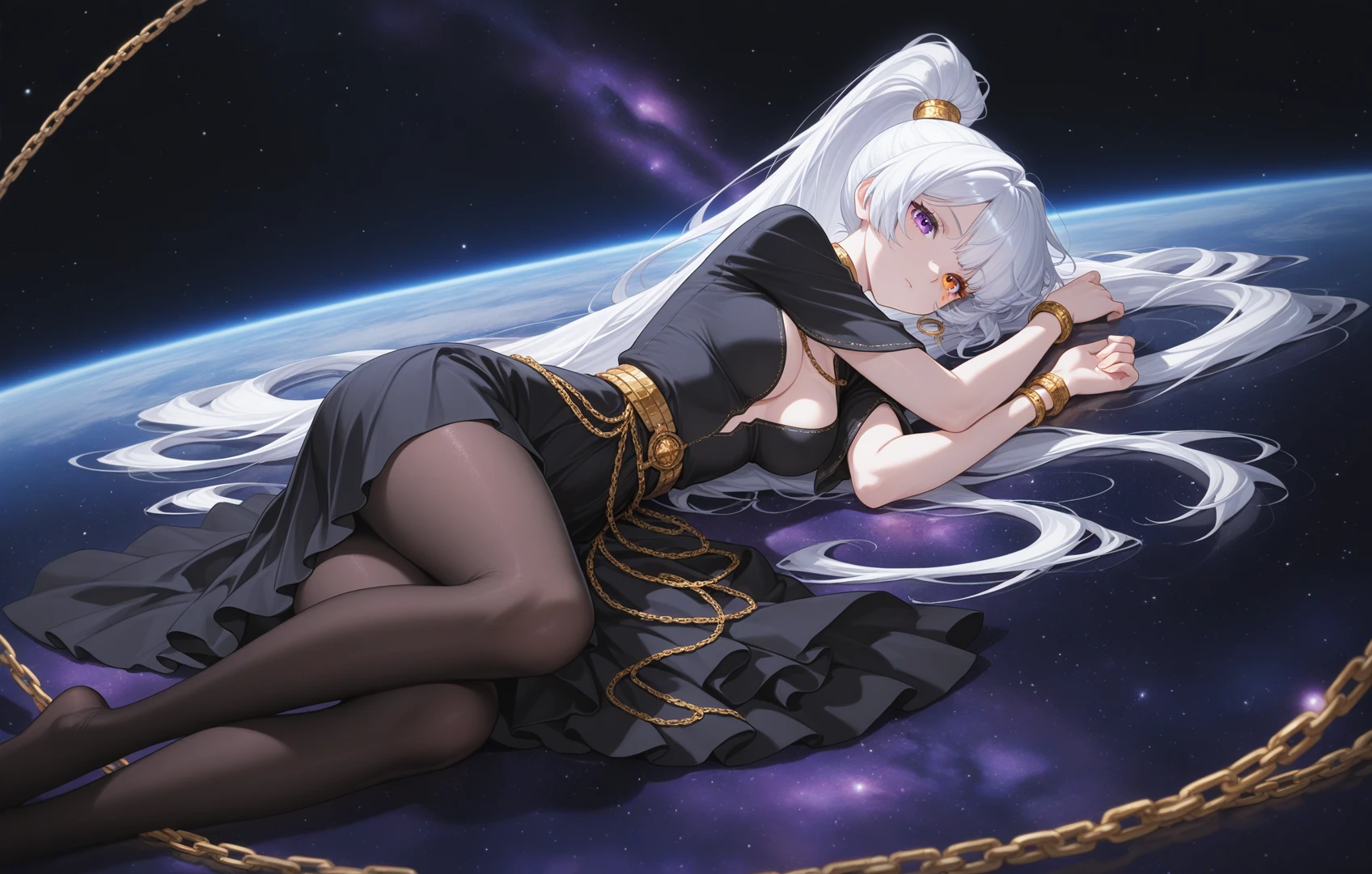 1girl, goddess, white hair, long ponytail, orange right eye, purple left eye, medium breasts,pantyhose, black dress with skirt, (chain Belt:0.5),