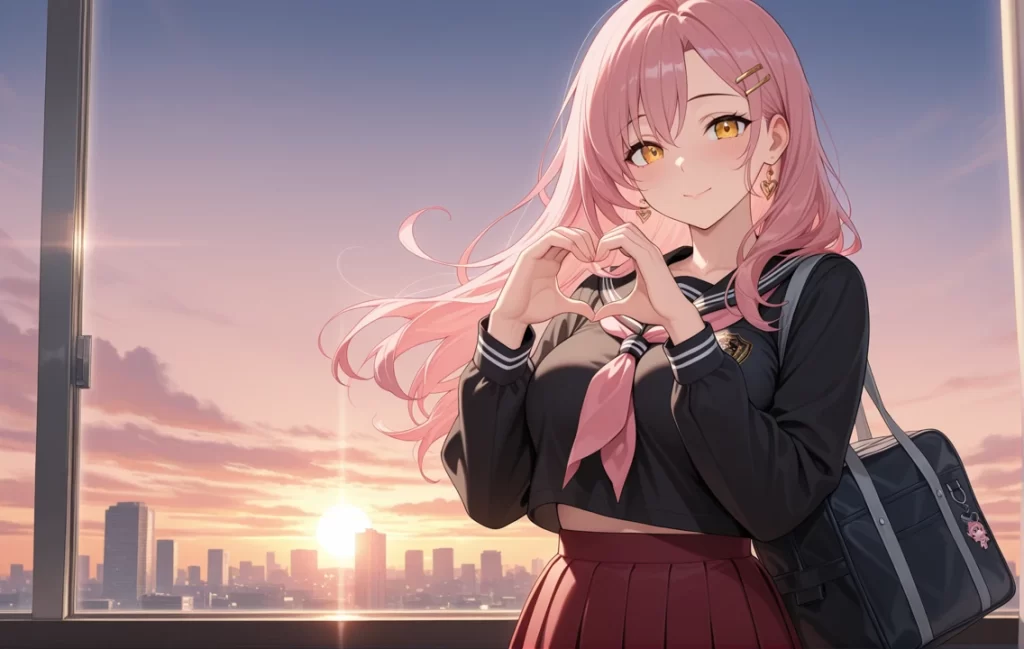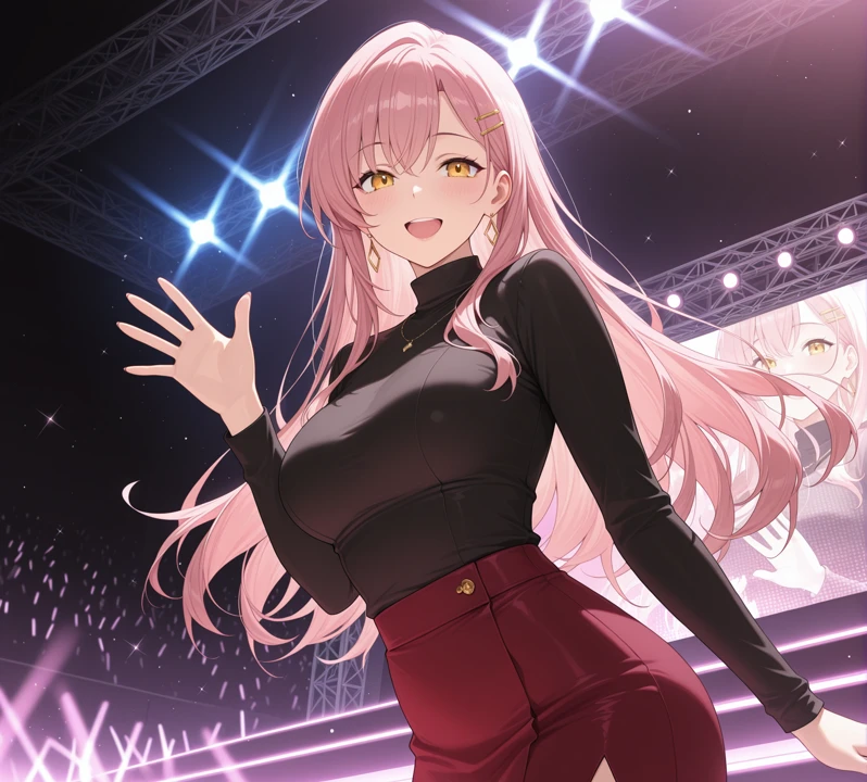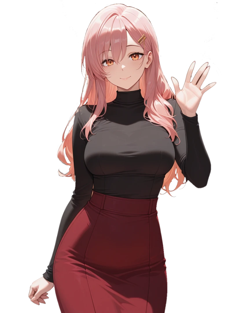 1girl, mature, long hair, pink hair, beautiful orange eyes, gold hair clip, medium breasts, black top, red skirt,